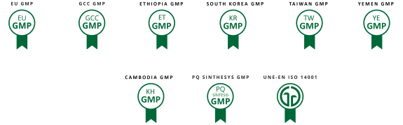 GMP para la fabricación y distribución de productos farmacéuticos otorgados por las autoridades sanitarias competentes en Etiopía, países del GCC, Corea, Taiwán, Yemen y Camboya.