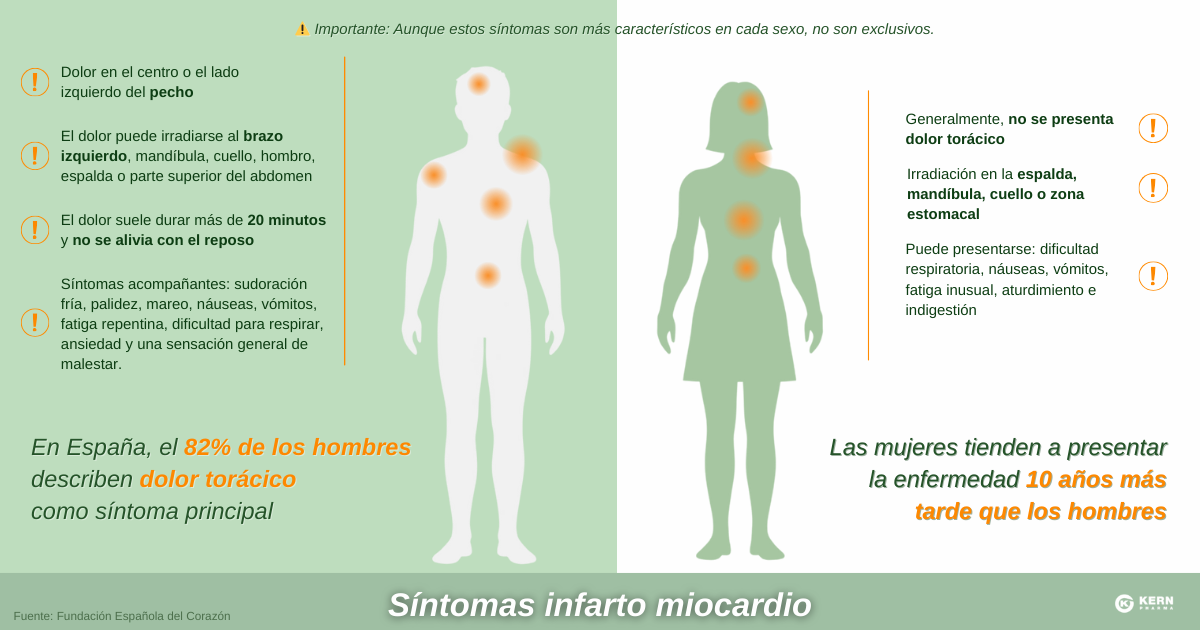 La Fundación Española del Corazón afirma que los síntomas de infarto pueden ser diferentes en mujeres porque su presentación suele ser menos típica y más difusa que en hombres, lo que dificulta el diagnóstico inmediato y aumenta el riesgo de retraso en la atención.